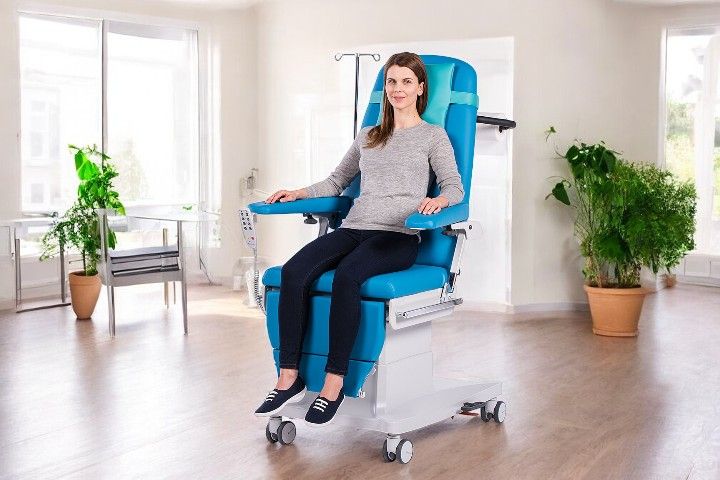 Mit einer Sitzbreite von 60 cm und der Möglichkeit, das Beinteil in einem Winkel von 90° zu verstellen, kann die »Multiline Next IT« auch als medizinischer Stuhl genutzt werden. Dies erleichtert den Einstieg für Patienten erheblich. Die extra weiche Polsterung und die gepolsterten Armlehnen sorgen für einen hohen Komfort, auch bei längeren Behandlungen wie der Chemotherapie.