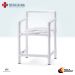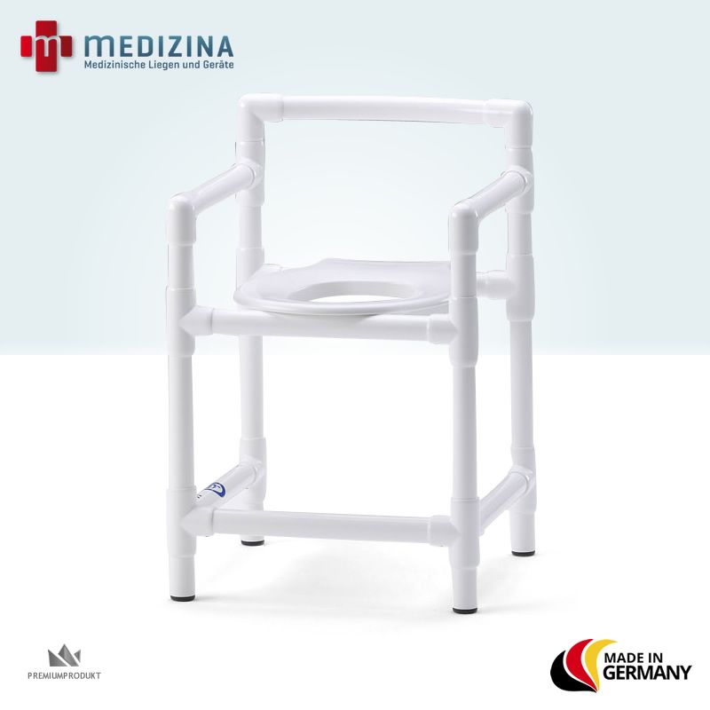 Toilettenüberstellbarer Duschhocker mit ergonomisch geformter Vollkunststoffbrille und 5 Jahren Garantie auf den Rahmen.